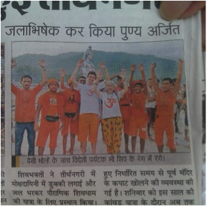 Durante el mes de Julio de cada año, más de un millón de personas, caminan desde diferentes ciudades de la India, hasta llegar al Templo de Shiva en Rishikesh. Allí la visitan y rezan, en un templo en lo alto de una montaña. Es impresionante ver a paralíticos rodarse por el piso, para llegar al templo. Viajan casi sin nada, muchos sin zapatos, solo chores y franelas de color naranja. Entonan unos cantos q terminan en la palabra «bamboleé». Un sábado en la noche, a petición y/o por invitación de los encargados del ashram, mi hijo y yo compartimos con ellos y nos tomaron fotos. Al día siguiente, aparecimos en toda la prensa local y una nacional. El reportaje es en hindú pero la foto es genialmente divertida.