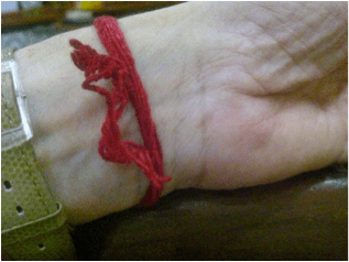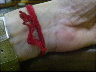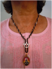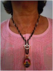 En el carro, ya de vuelta, iba conversando con Dios y verificando lo que deseaba. De repente, mi hijo me dijo: <mama, ¿como hiciste eso tan bello con tus cadenas?> Las miré en el espejo y me di cuenta, que una cadena con la flor de Liz, símbolo de meditación y un cordón con una cadena de Shiva, se habían mezclado de una manera que parecía hecho adrede, bello realmente, difícil de hacer por si mismos. Posteriormente, trate de hacerlo y me di cuenta que no había sido fácil que se cruzaran. Lo tomé como una respuesta de Dios. Uniendo mi fe en Dios y practicando la meditación, lograría hacer el proyecto que desde hace año y medio se ha ido desarrollando en mi mente, completándose en mis sueños, por capitulos.