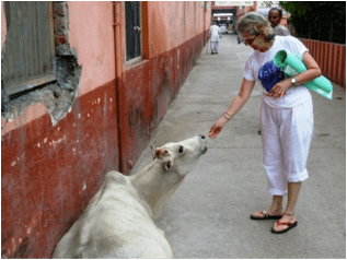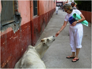 A las 7 AM cuando regresábamos de clases de yoga, mi hijo y yo, siempre comprábamos bananas y mangos. Al lado de los vendedores, siempre estaba un perro y una vaca. Observe que la vaca olía la bolsa de las frutas, así que comencé a darles comida diariamente. Uno de los días, el perro estaba esperándonos a las 6 AM, cuando pasábamos a clases. El perro nos siguió al salón y se sentó en mi manta de yoga. La maestra vino y lo ahuyentó, tres veces y tantas veces el regresaba a mi lado. Ella me miró con extrañeza y yo le expliqué: todas las mañanas le damos desayuno, creo que hoy lo quiere más temprano. Toda la clase rió y ella lo ahuyentó nuevamente y cerró la puerta para que no pudiera retornar. Sin embargo, estaba esperando como siempre, al lado del frutero, cuando salimos de clases.
