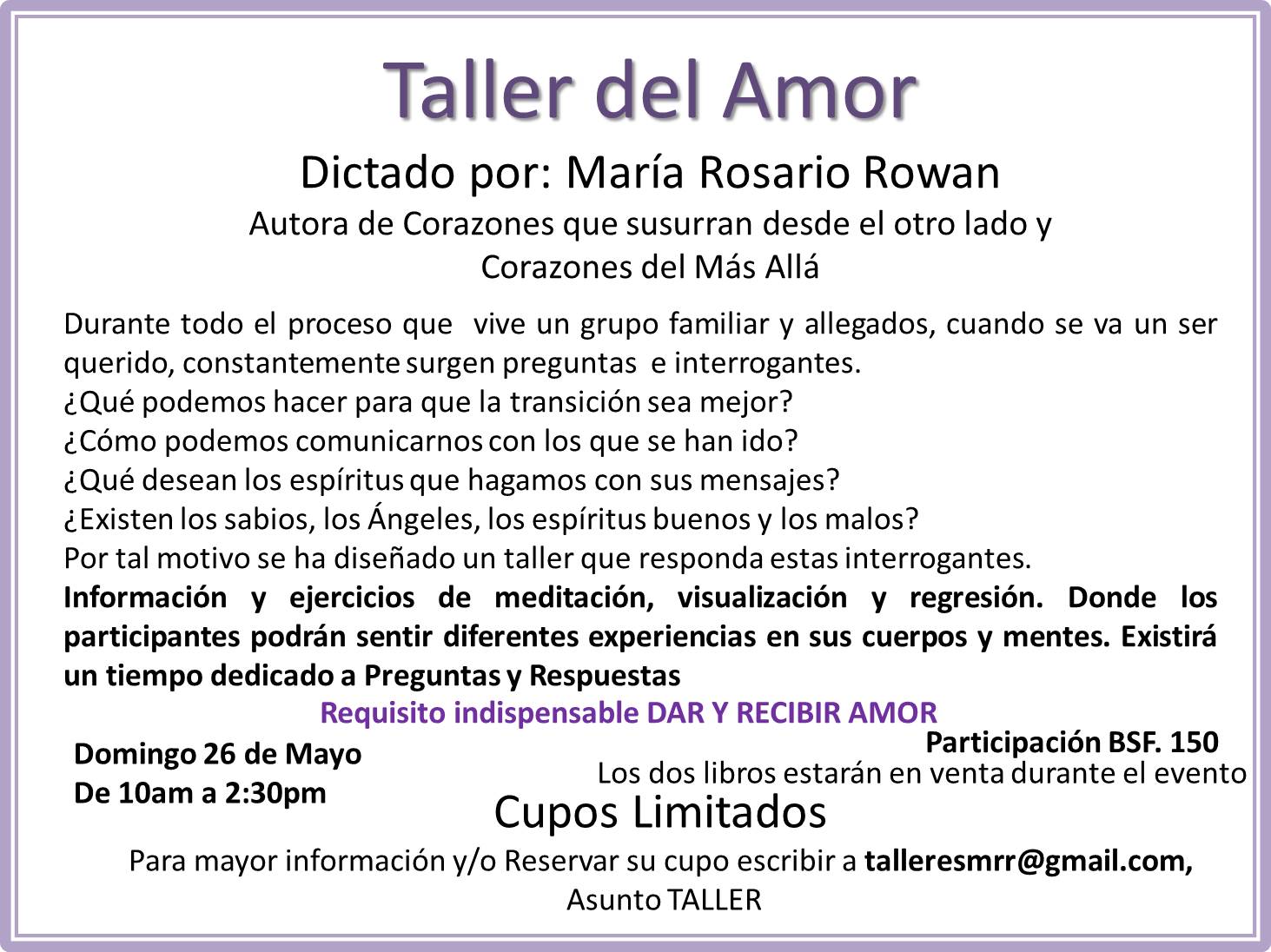 El Taller del Amor lo realizo en memoria de Betsa Marcano De la Rosa.  En el trato de ayudar a los que han perdido a un ser querido a encontrar respuestas sobre la vida despues de lo que llaman muerte y a aprender a  contactar a nuestros seres en el otro plano.